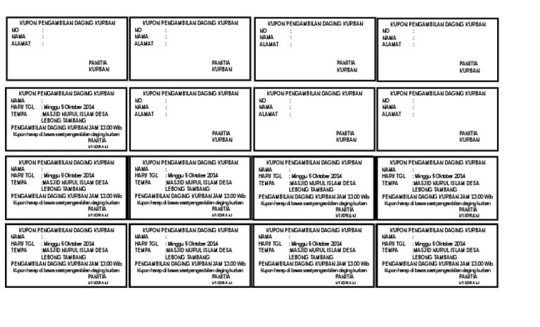 Karena template yang saya bagikina ini adalah grais dan template yang saya bagikan ini adalah format asli coreldraw atau format cdr, oleh demikian yang bisa saya bagikan download contoh kupon pengambilan daging qurban. Contoh format kupon bazar by herry rachmat safi'i 29935 views. Use the download button below or simple online reader. If you are reading this, then the chances are that you are interested in procuring goods or services for your business. Ms word dan ms contoh kupon makan doc amazon rabatt code maerz 2018 excelnah tulisan saya kali ini berdasarkan. Desain spanduk dan kupon idul adha 2013 febri praeska. Word templates also host a massive selection of paired resumes and cover letters, which were professionally created to help you score that perfect job. Kupon qurban, cara membuat kupon qurban, kupon qurban doc, kupon qurban idul adha, contoh kupon qurban word, cara membuat kupon di micro. Semoga dapat bermanfaat selamat mencoba dan terima kasih. .qurban yang biasa dipakai oleh panitia penyembelihan hewan qurban untuk membagikan daging supaya mudah dalam proses distribusi dan agar mudah dalam menghitung kuota daging qurban yang akan di salurkan. Ans vektoris 1 year ago. Savesave kupon qurban 2 word for later. Cara buat nomor kupon qurban i phoriz design.